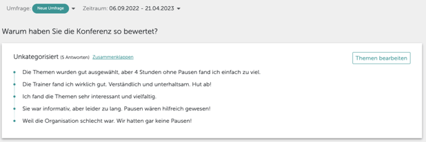 3. Über den Button „Themen bearbeiten“ kannst du individuelle Kategorien für deine Freitextantworten anlegen und anpassen. Jede Kategorie muss zwischen 3 und 100 Zeichen umfassen.