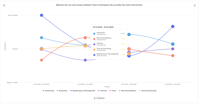 Die Themen-Trend-Analyse zeigt auf einen Blick, wie sich die Stimmung (Sentiment) zu verschiedenen Themen im Zeitverlauf entwickelt hat. Es hilft dir dabei, Trends und Veränderungen in der Wahrnehmung von Themen zu erkennen — z. B. ob die Stimmung zu Work‑Life‑Balance oder Kommunikation positiver oder negativer geworden ist.