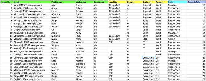 Wenn du "ReportsToId", "PermissionGroup" oder "PermissionGroupValue" verwenden möchtest, ist es in Ordnung, nur Informationen für einige Mitarbeiter einzugeben und nicht für andere.