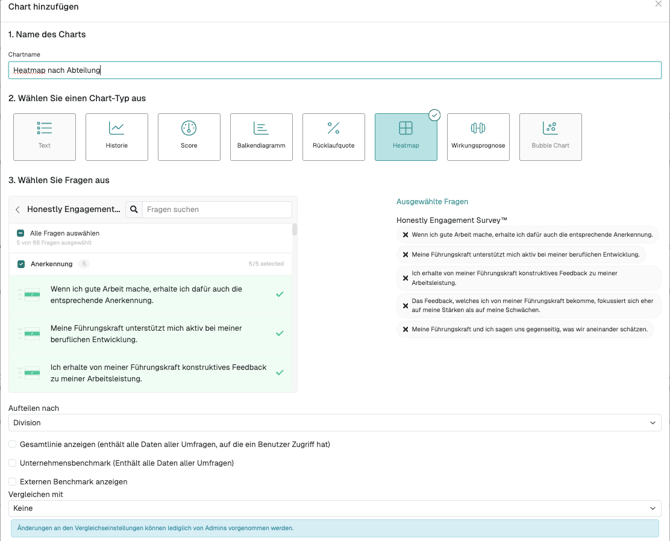 Während der Konfiguration kannst du eine oder mehrere Fragen auswählen und anschließend das Attribut festlegen, nach dem du die Ergebnisse zum Vergleich aufschlüsseln möchtest. In der Praxis kannst du die Ergebnisse zum Beispiel nach Abteilung, Berufserfahrung, Alter oder jedem anderen zuvor definierten Attribut splitten.