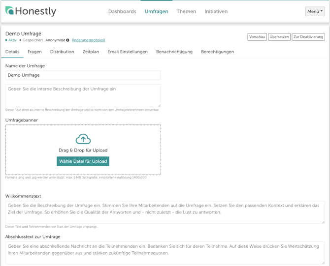 18. Klicke auf "Speichern" und du hast deine Umfrage erstellt, aktiviert und die Einladungs-Mails werden an die gewünschten Mitarbeiter zum angegebenen Zeitpunkt verschickt: