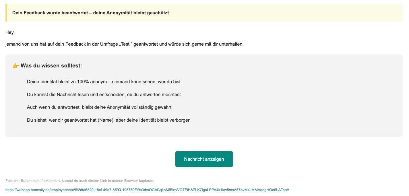 Mitarbeitende: Erhalten Benachrichtigung per E-Mail und können sich dazu entscheiden, anonym zu antworten.