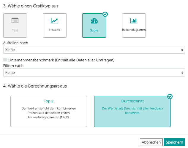 Benennen Sie Ihre neue Grafik und wählen Sie die Frage aus, dessen Ergebnisse Sie gerne darstellen würden. Bitte beachten Sie, dass Sie nur skalierte Fragen die Möglichkeit haben zwischen einer Top2- oder einer Durchschnittsberechnung zu wählen.