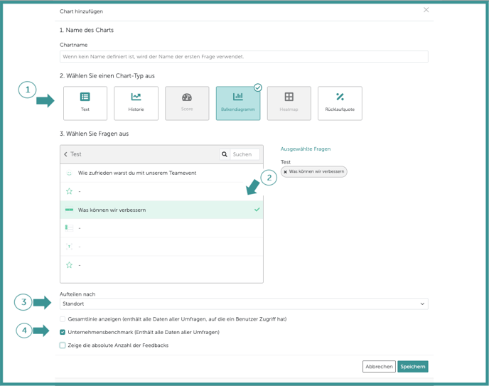 Beispiel: Meine Umfrage hat 16 Fragen, aber die ersten 4 Fragen werden zum Thema Zufriedenheit gezählt, dann können Sie diese 4 markieren und als ein Chart anzeigen lassen.
