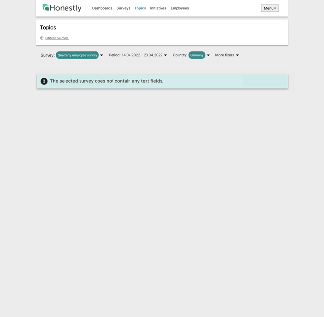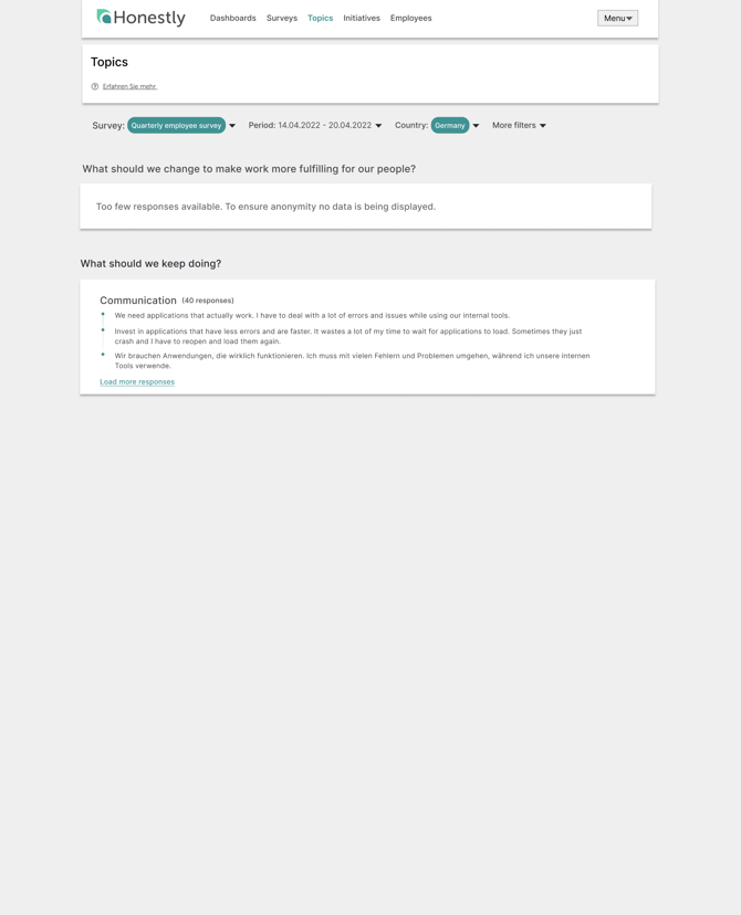 Please note: Topics are sorted alphabetically. The uncategorised responses always show up first, if there are non-assigned responses. If all responses of a question are assigned to a topic, the uncategorised section will disappear. Responses from the uncategorised or any other topic section will only disappear from the section once it has either collapsed or the user leaves the edit mode. If less responses than the anonymity level of the survey requires have been given, no responses will be visible. Topics, which have been created but have no assignments for the selected survey, will not show up on the page.