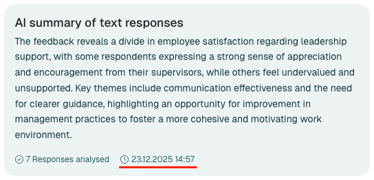 Each AI-generated summary remains available for 8 weeks from the moment you first open it. If new responses are added during this period, the summary will be refreshed automatically.